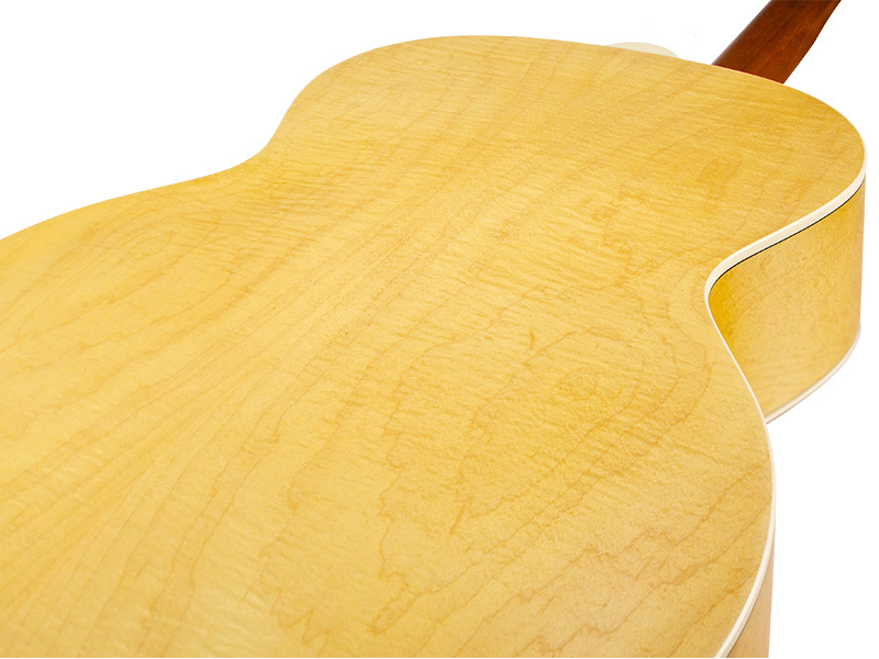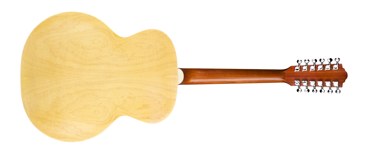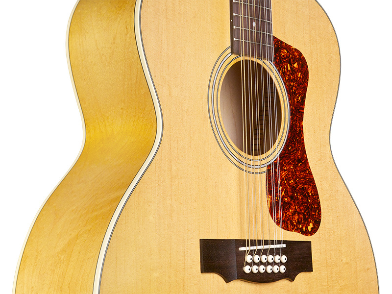 The F-2512E Maple combines two of Guild’s most iconic specialties: twelve string and jumbo guitars. With their large, rounded bodies, jumbo acoustic guitars have been Guild’s forte since 1954; combining this shape with the ever-popular 12-string construction results in a full-toned, impressively voiced acoustic instrument. Built with a solid spruce top, maple sides, and arched maple back, the F-2512E Maple has the bright, jangly tone characteristic of Guild’s twelve string guitars. Guild’s signature arched back design allows for great volume and projection, long sustain, and a lush, full sound. The F-2512E Maple features Guild’s AP-1 pickup, a bone nut and saddle, pearloid rosette, period-correct tortoiseshell pickguard, and a matte polyurethane finish. This model also includes Guild’s new lightweight deluxe gig bag. Available in Natural.