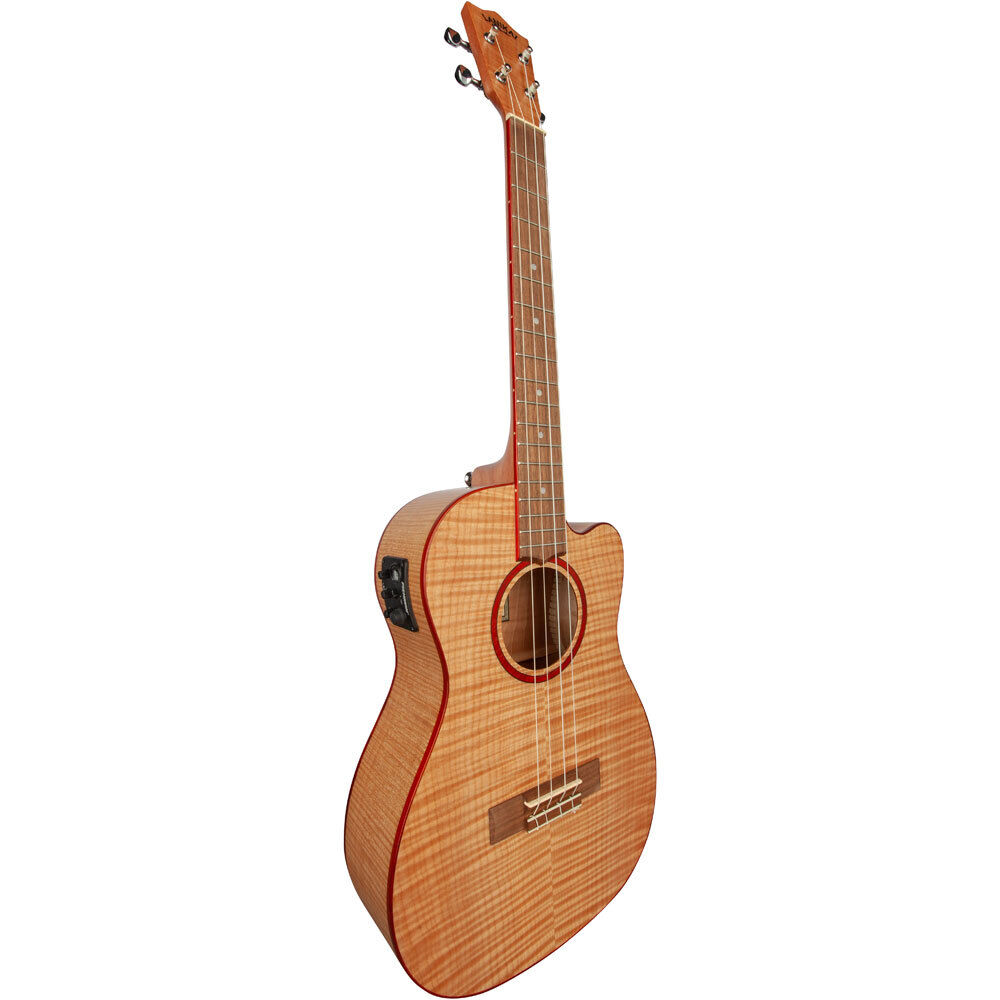 The Flame Maple with blood wood binding cutaway electric baritone ukulele has an adjustable truss rod for easy action adjustments, a wider nut for player comfort, select figured wood, open back tuners, wood marquetry, NuBone XB nut and saddle, DAddario strings, a Fishman Kula preamp and tuner, satin finish, a padded gig bag. Our very popular Lanikai Flame Maple ukuleles have a bright crisp tone with comfortable playability and striking looks.