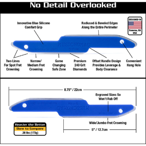 Say no to black markers, constantly checking and worrying about overfiling, Music Nomad takes fret crowning to the next level with our game-changing patent pending Safe Zone "S-File". Packed with so many unmatched features and benefits, we can't even list them all here.
