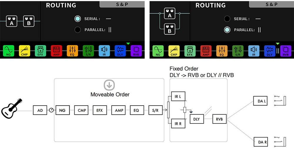 - NG, EFX, AMP, I.R., EQ, S/R; DLY, RVB effect blocks with free/parallel routing order.