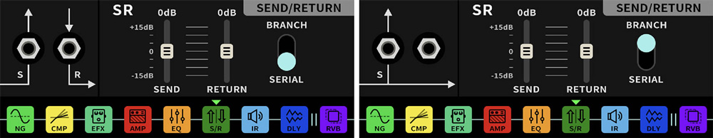 - In Branch Mode, the Send jack sends the signal before the IR signal block to a real amplifier (Power Amp In), while simultaneously sending the outputs with IR signals to the PA system or FRFR amp.