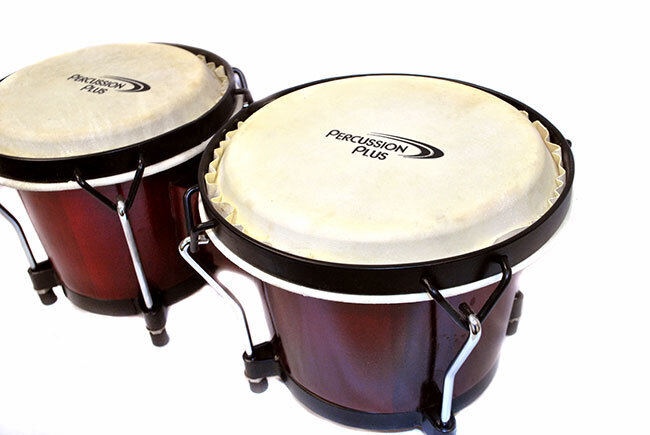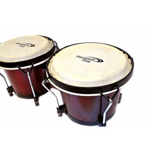 This Percussion Plus wooden bongo set comes in a gloss red lacquer finish and features 6" & 6-3/4" natural hide heads, wood shell construction and black powder coated hardware.