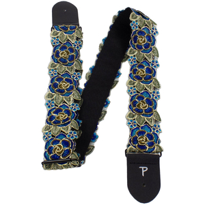 Perris 2" wide stitched 3D Lace Ribbon guitar strap in Blue & Gold Floral Design. This strap is adjustable in length from 39" to 58".