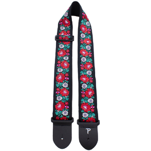 Perris 2.5" wide guitar strap made from high quality jacquard ribbon sewn on tubular webbing with Black Genuine leather ends. Featuring a Red Floral on Black Design. It is adjustable in length from 39" to 58"
