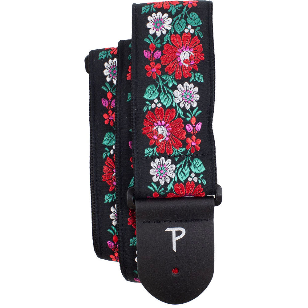 Perris 2.5" Jacquard Guitar Strap with "Red Floral on Black" Design & Leather ends