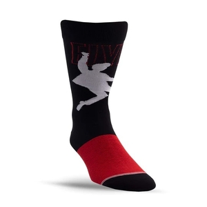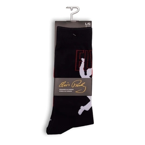 Knit in stage lights Elvis logo and dancing Elvis silhouette on center front of leg with bold stripe on foot