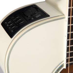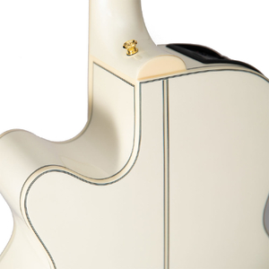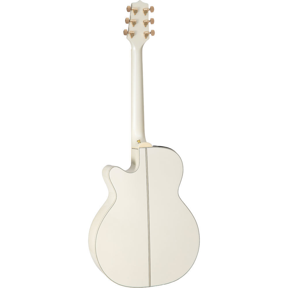 Finished in elegant gloss pearl white, this NEX guitar features ivoroid binding over the body, fingerboard, and headstock. Touched with gold hardware, pearl dot inlays, and a beautiful abalone rosette, this guitar exemplifies elegance and striking simplicity. The tonewoods create a very shimmering, punchy, bold sound that is great across a wide variety of musical styles that is 100% Takamine.