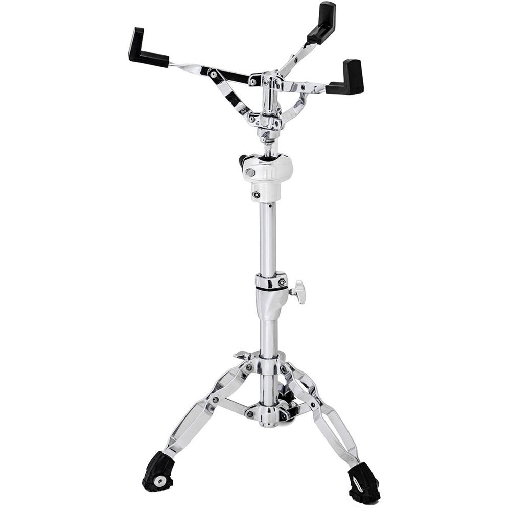 The basket is centered directly over the stand base to improve the balance of heavier drums and to allow unobstructed positioning of the feet between the pedals. The adjustable base height allows the entire center tube and basket to drop down fully, providing room for the added height of deeper snares. The high-friction rubber feet with retractable spikes for rugs or mats stop the stand from shifting around during aggressive play.
