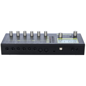 The Pulse 2 is housed in a robust metal desktop case. You get a large LCD display and eight stainless steel knobs, making it easy to surf through the Pulse 2's logically arranged parameter matrix, set your master volume, and edit your patch parameters.